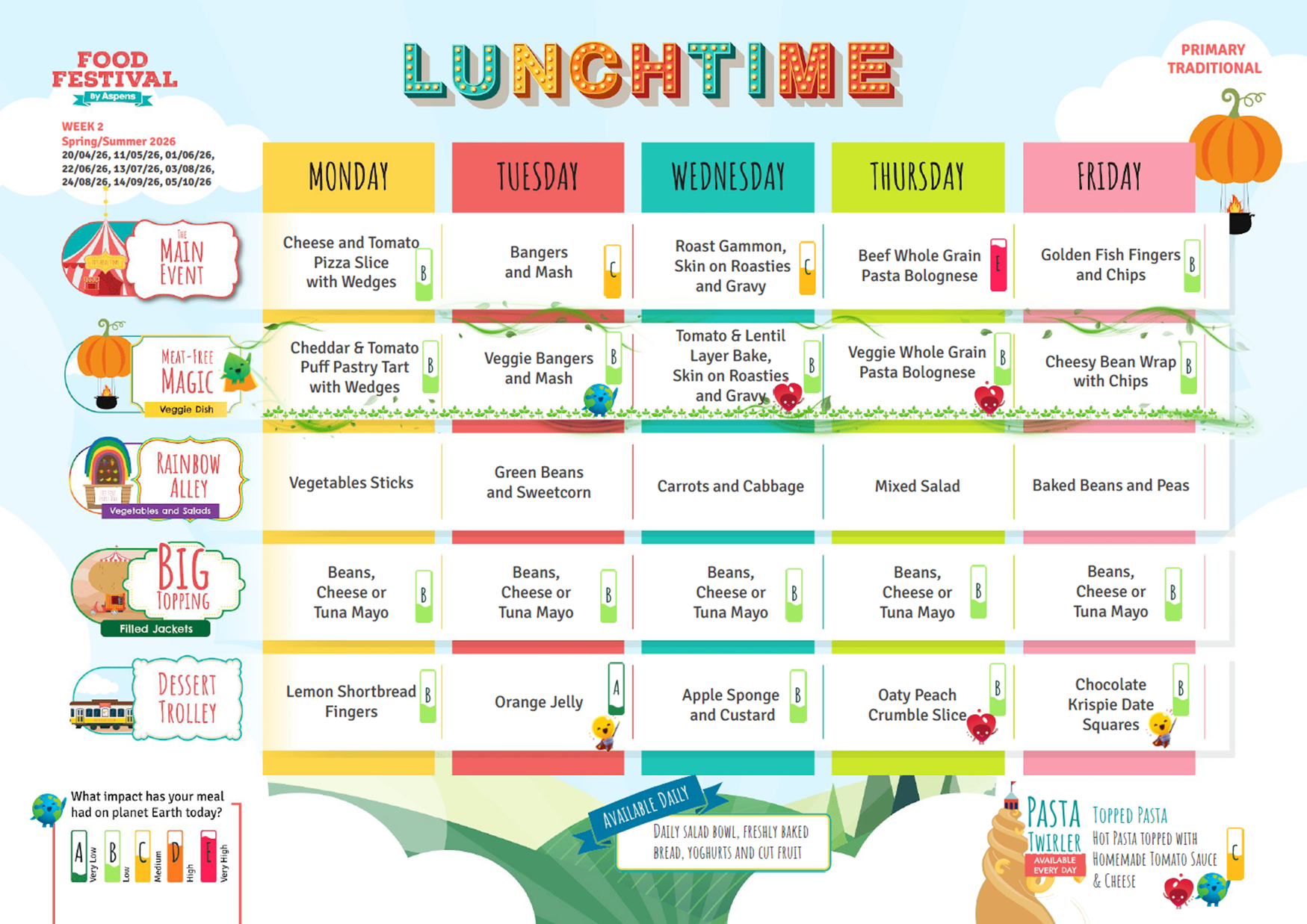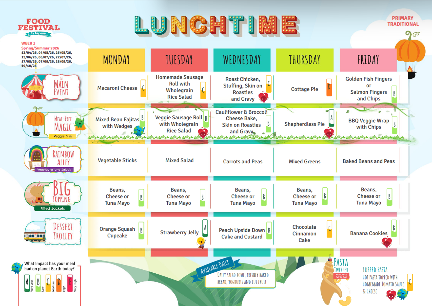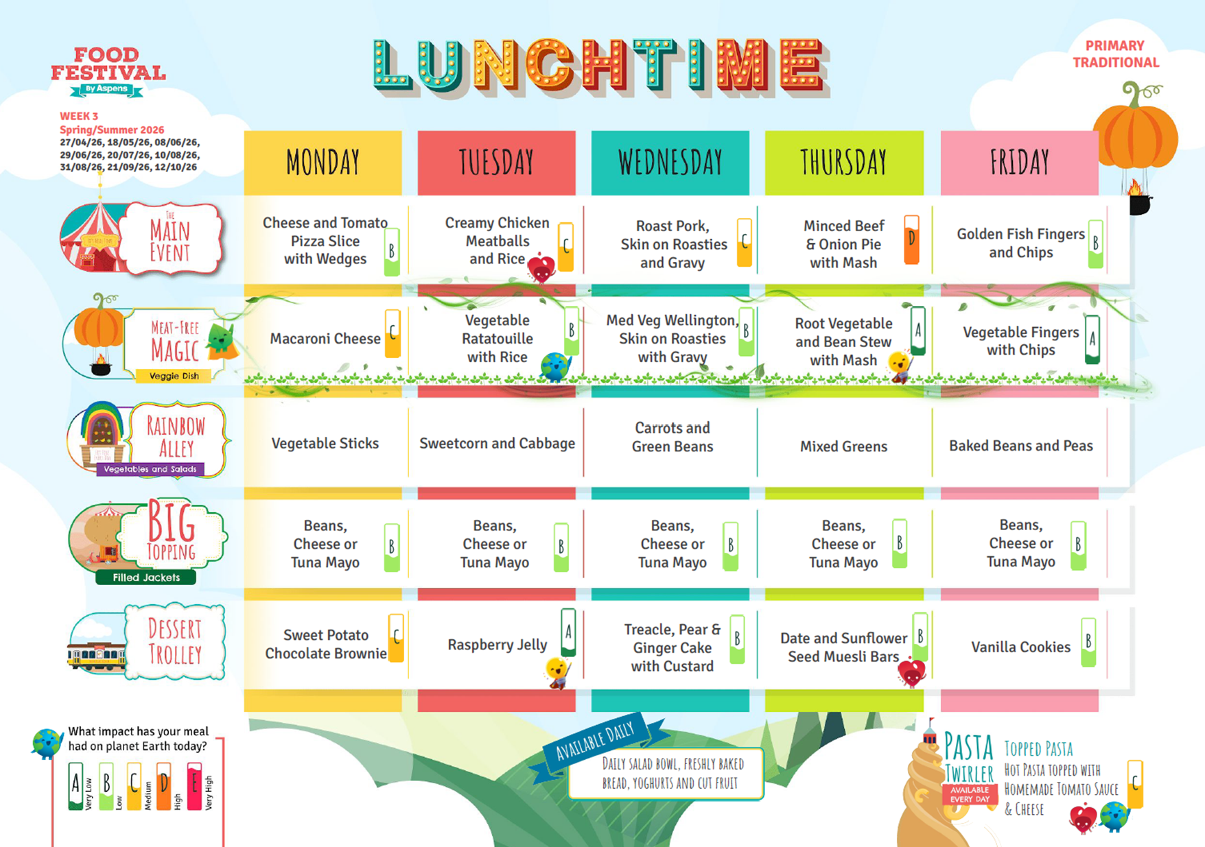 The school menu rotates on a three-week basis and refreshes for Autumn/Winter and Spring/Summer seasons.